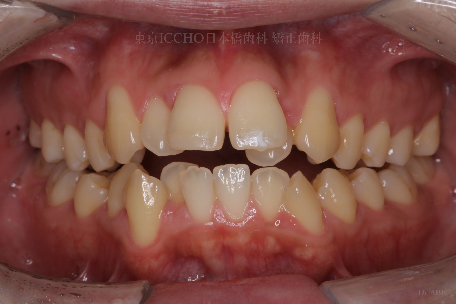 - 上顎の前⻭は⻭の⼤きな乱れを治すために連続して6本つながっているセラミックが⼊っているため、⻭の位置を修正するため、矯正治療を⾏い全体的に⻭並びの修正を⾏った。